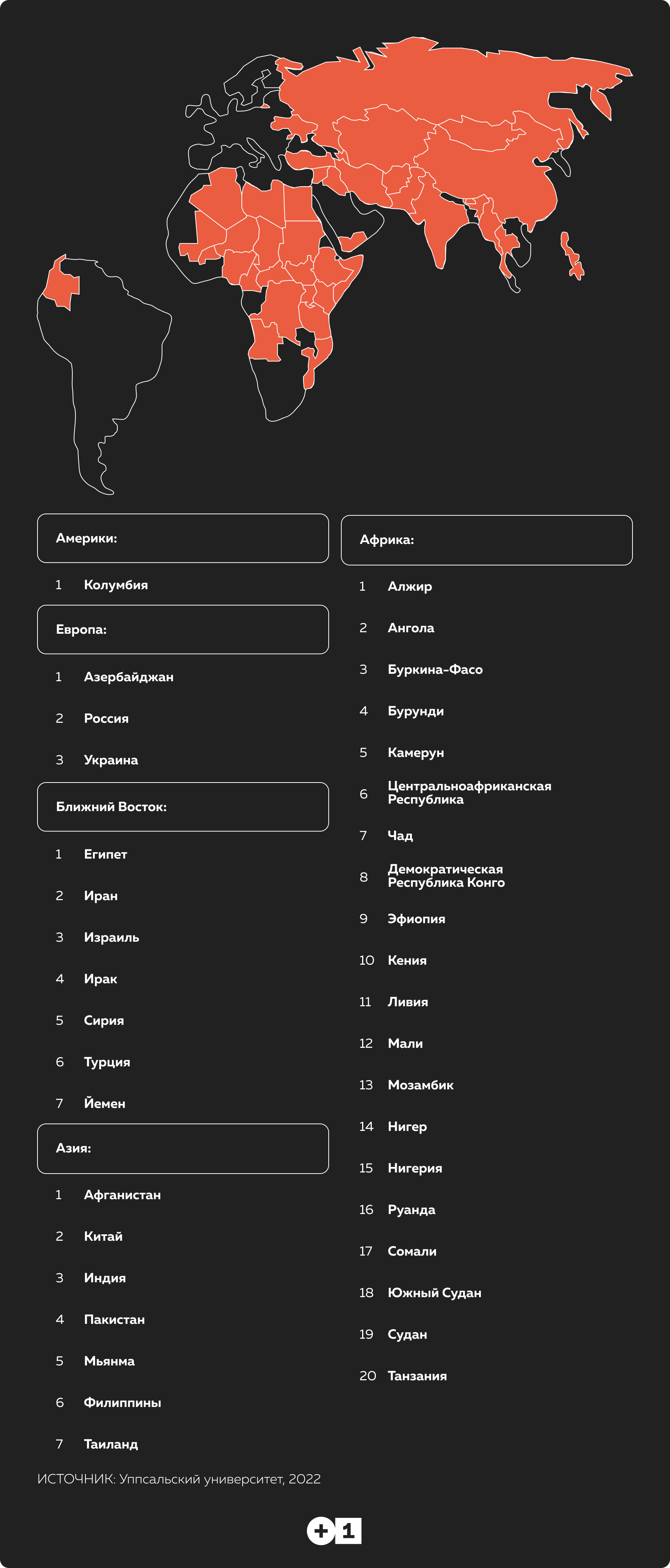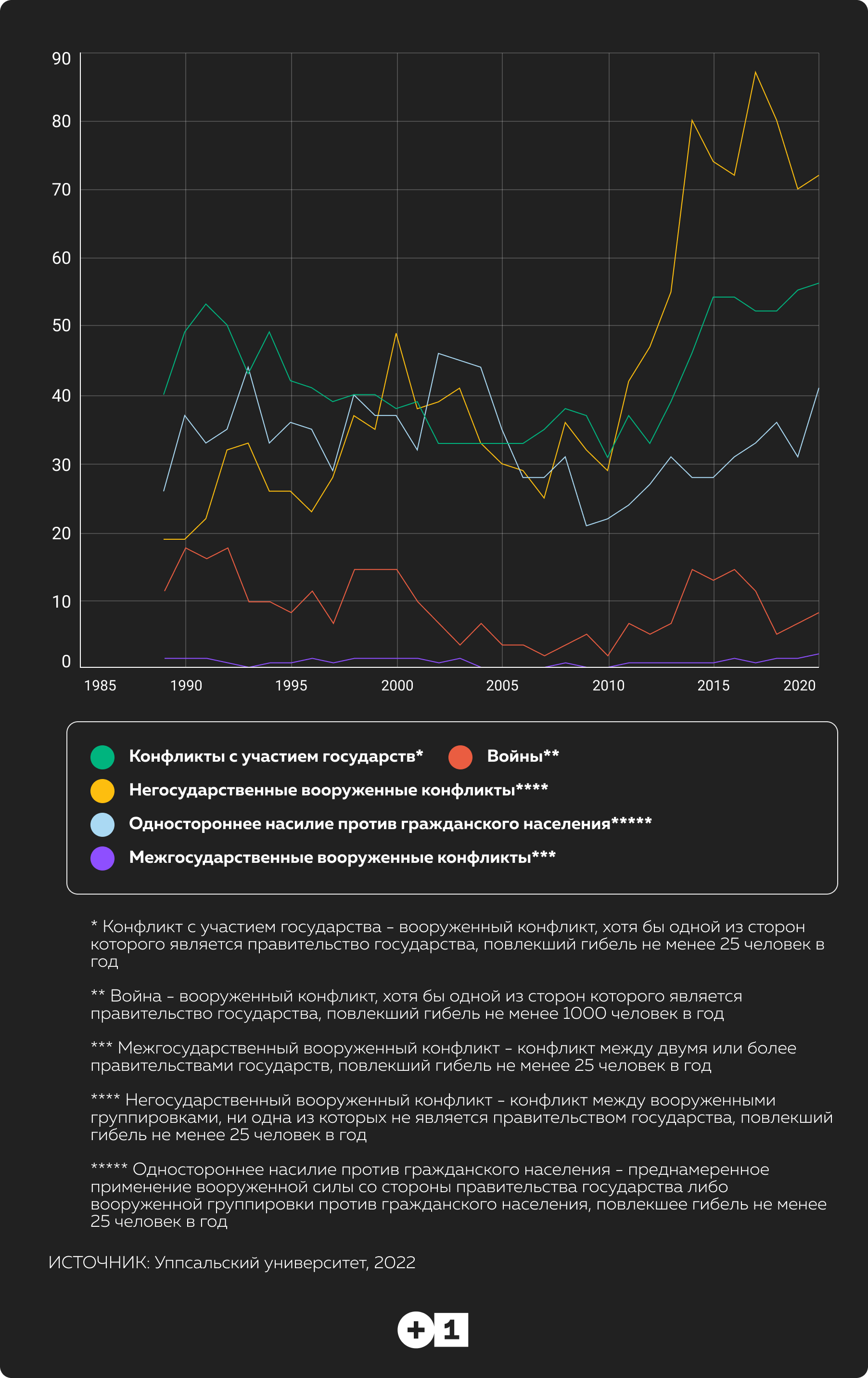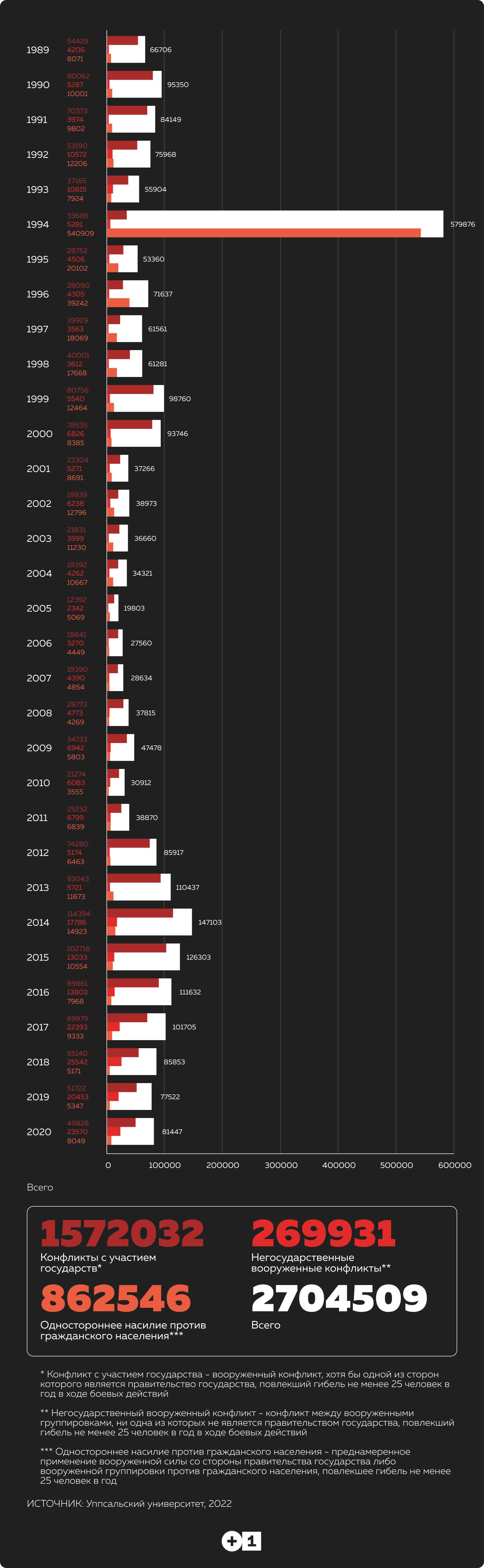 Plus-one.ru изучил статистику Уппсальского университета — одной из самых авторитетных исследовательских организаций, публикующих глобальные данные о вооруженных конфликтах.